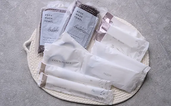 シャンプー、コンディショナー、ボディーソープ、ハンドソープ、歯ブラシ、歯磨き粉、カミソリ、ヘアブラシ、綿棒、スリッパをご用意しております。